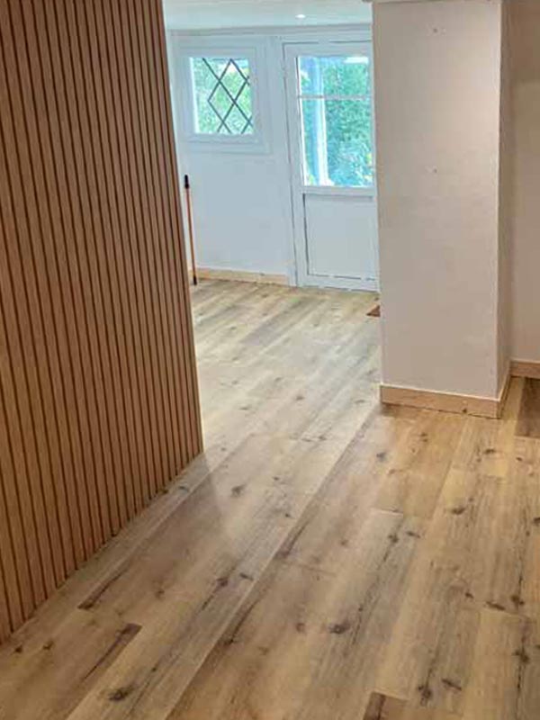 Pour un sol esthétique, résistant et facile d’entretien, le plancher flottant ou vinyle est un excellent choix. CRDJ assure une pose précise, en respectant les étapes essentielles : préparation et mise à niveau du support, pose d’une sous-couche adaptée pour améliorer l’isolation phonique et thermique, ajustement soigné des lames ou dalles, et finitions impeccables au niveau des plinthes et seuils. Chaque installation est réalisée dans le respect des matériaux et des contraintes techniques de la pièce, pour un résultat durable, confortable et agréable à vivre.